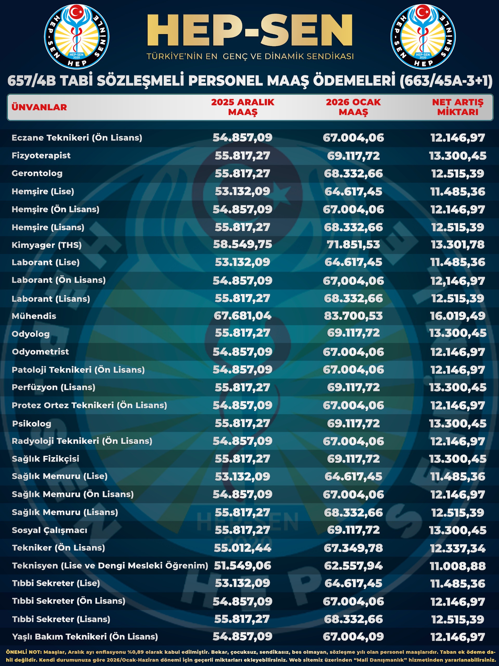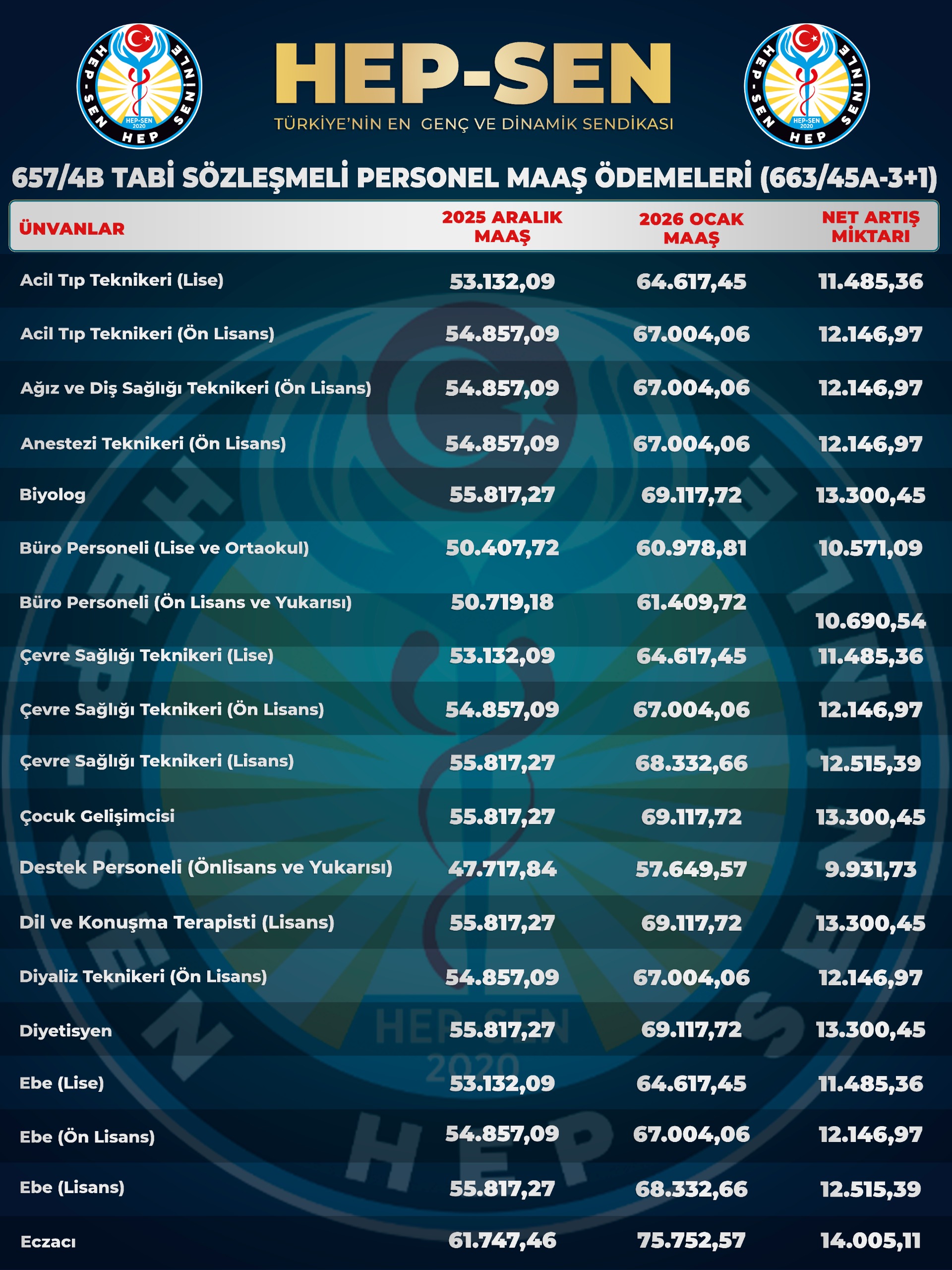 HEP-SEN Mali Danışmanlarımız, 2026 Ocak Ayı (657/4B Tabi Sözleşmeli Personel ( 663 / 45A - 3+1 )) sağlık çalışanlarının zamlı maaşlarını sizler için hesapladı.