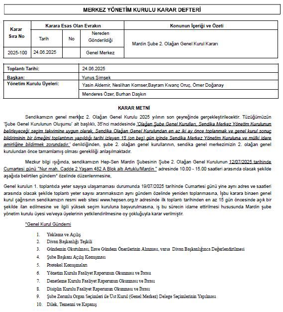 Hep-Sen Mardin Şubesi’nin 2. Olağan Genel Kurulu, 12 Temmuz 2025 Cumartesi günü saat 10.00 – 15.00 arasında,