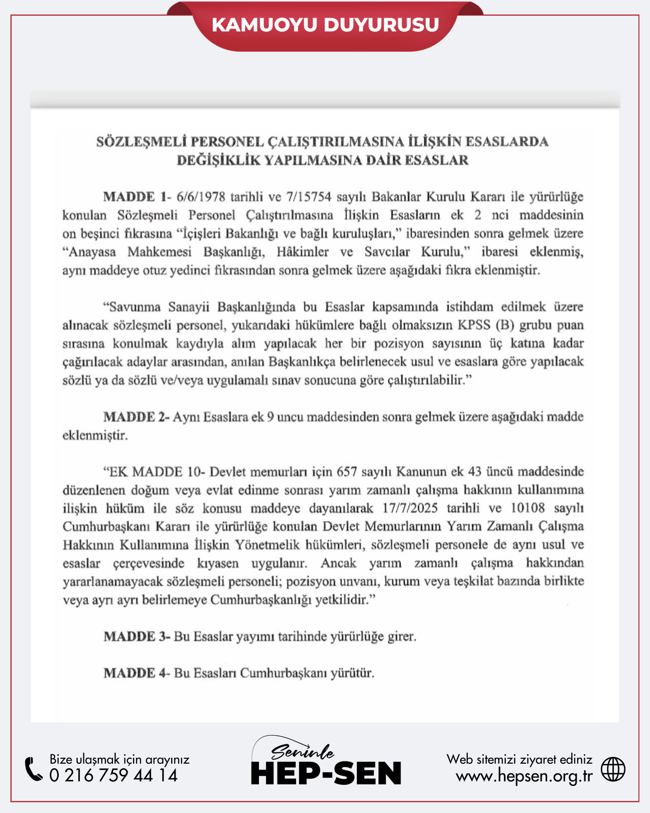 HEP-SEN olarak kurulduğumuz günden bu yana "ayrımcılığa son" dedik! Kamuda kadrolu ve sözleşmeli personel arasındaki uçurumu kapatmak adına yürüttüğümüz kararlı mücadelede bir zafer daha kazanıldı. Resmi Gazete’de yayımlanan "Sözleşmeli Personel Çalıştırılmasına İlişkin Esaslarda Değişiklik Yapılmasına Dair Esaslar" ile sözleşmeli personelimize doğum ve evlat edinme sonrası yarım zamanlı çalışma hakkı resmen tanındı.