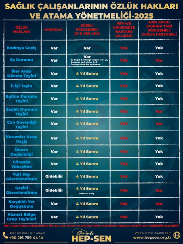 Türkiye’de sağlık çalışanları, farklı statülerde istihdam edilmeleri nedeniyle aynı görevi yapmalarına rağmen özlük haklarında, tayin ve atama süreçlerinde ciddi farklılıklar yaşamaktadır. HEP-SEN olarak bu farkları görünür kılmak, eşit işe eşit hak mücadelesini güçlendirmek amacıyla, “Sağlık Çalışanları Özlük Hakları Tablosu” ve “Atama ve Yer Değiştirme Yönetmeliği Özeti”ni bir araya getirdik.