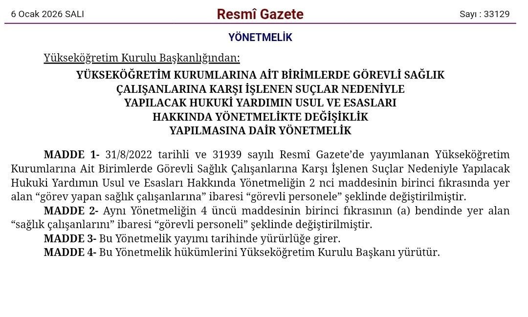 Yükseköğretim Kurumlarına Ait Birimlerde Görevli Sağlık Çalışanlarına Karşı İşlenen Suçlar Nedeniyle Yapılacak Hukuki Yardımın Usul ve Esasları Hakkında Yönetmelikte Değişiklik Yapılmasına Dair Yönetmelik Yayımlandı