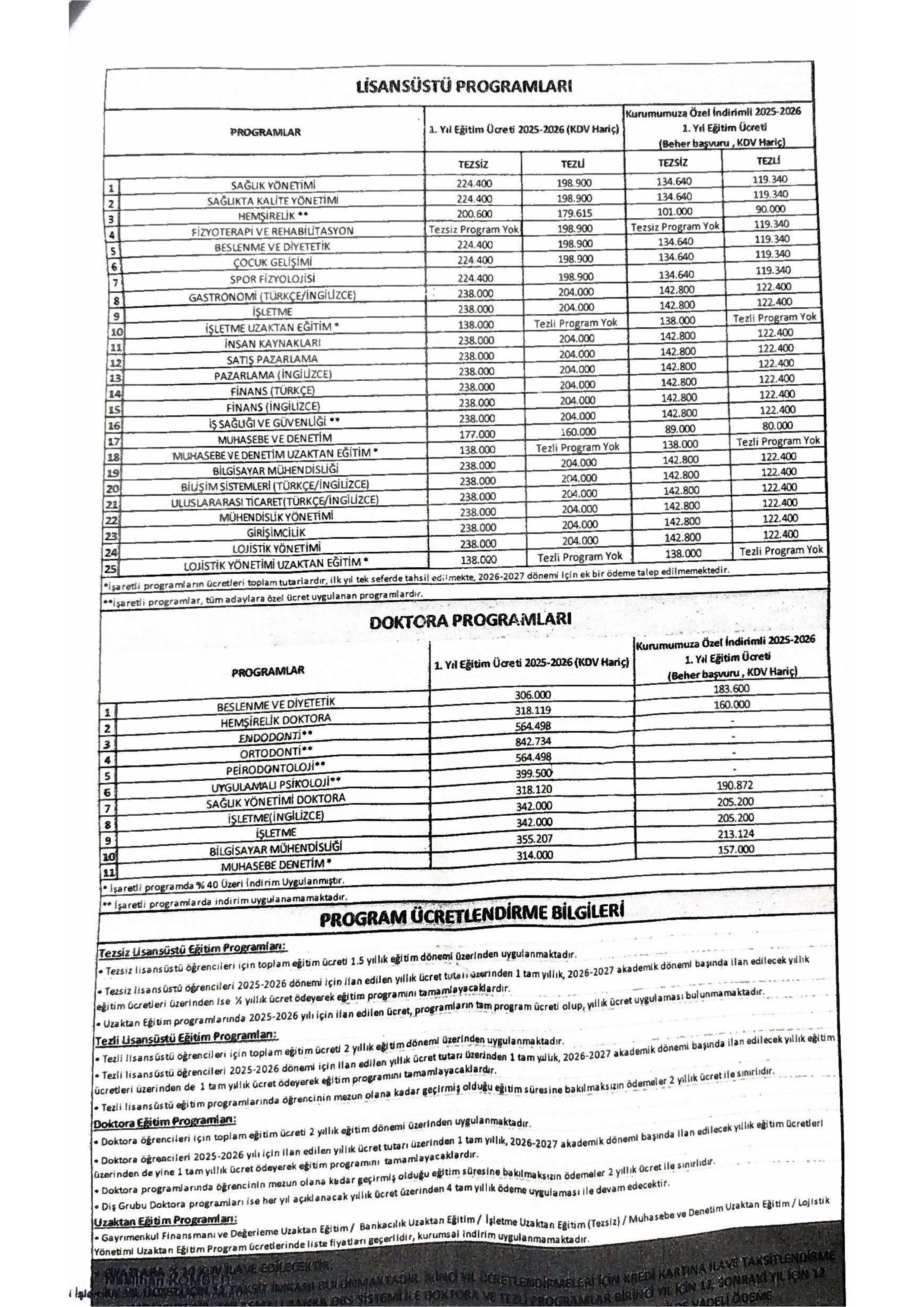 Detaylar için 0212 212 65 26 numaralı telefonu arayarak, Dahili 1317, 1314 veya 1323’ü tuşlayabilirsiniz. *Fiyatlara %10 KDV eklenecektir. Doktora programlarında 24 taksit yapılabilecektir.